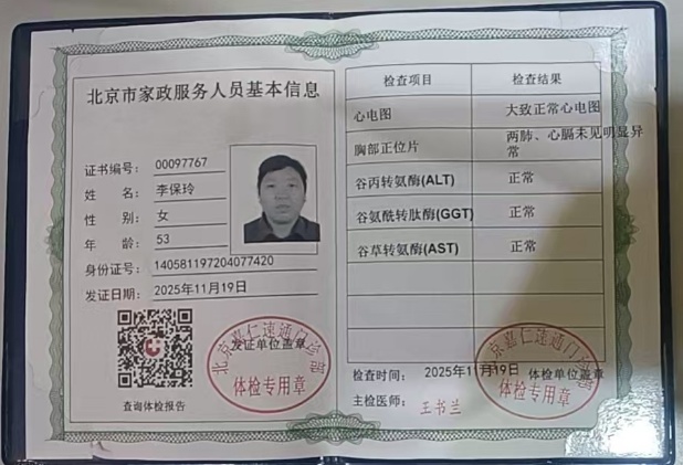 姓名:,李宝玲 年龄:53 属相:鼠 籍贯山西晋城 民族:汉 身高:165 体重:155 学历:初中 证件:健康证,身份证,护老证 工作经历: 2003年在养老院照顾老人 2004年到2005年在北京住家。照顾独居半自理老人,负责老人饮食起居,照顾过卧床老人,翻身,吸痰,都