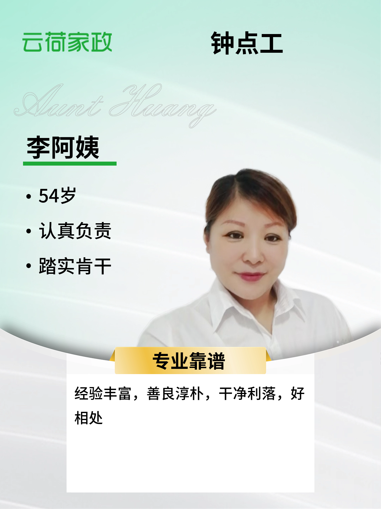 温馨提示:云荷家政平台发布的简历信息由劳动者本人提供,云荷家政平台对信息的真实性、及时性、正确性均不做任何形式保证。