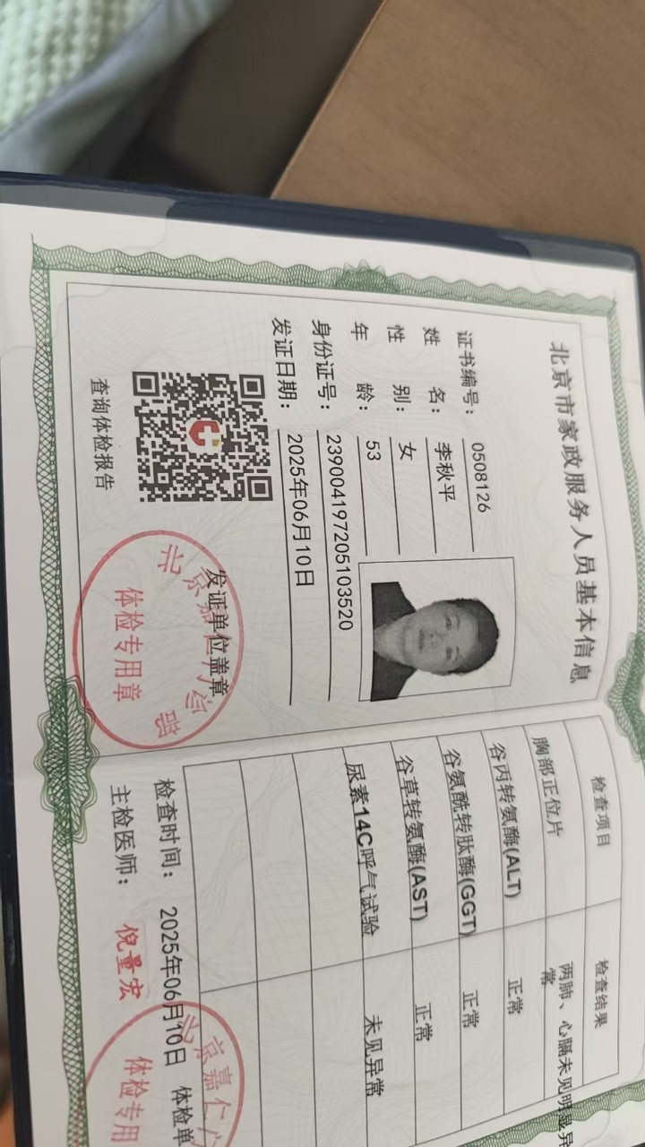 姓名:李秋平 年龄,54岁 身高,160米 体重,62公斤 贯籍,黑龙江 2023—2025年在别墅做住家保姆,照顾老人,做饭做家务收纳等 特长:爱做饭,各种家常小炒 各种面食煲汤 ,拼盘 ,大锅菜包子饺子花样面食等等。 自我评价,善良淳朴,干净利落,听丛客户的安排,好相处。