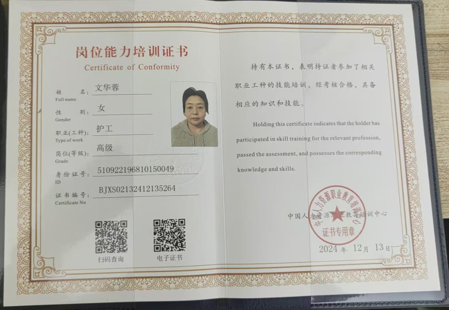 ✅ 高级护工岗位能力培训证书(2024 年 12 月取得,中国人力资源职业教育培训中心颁发)