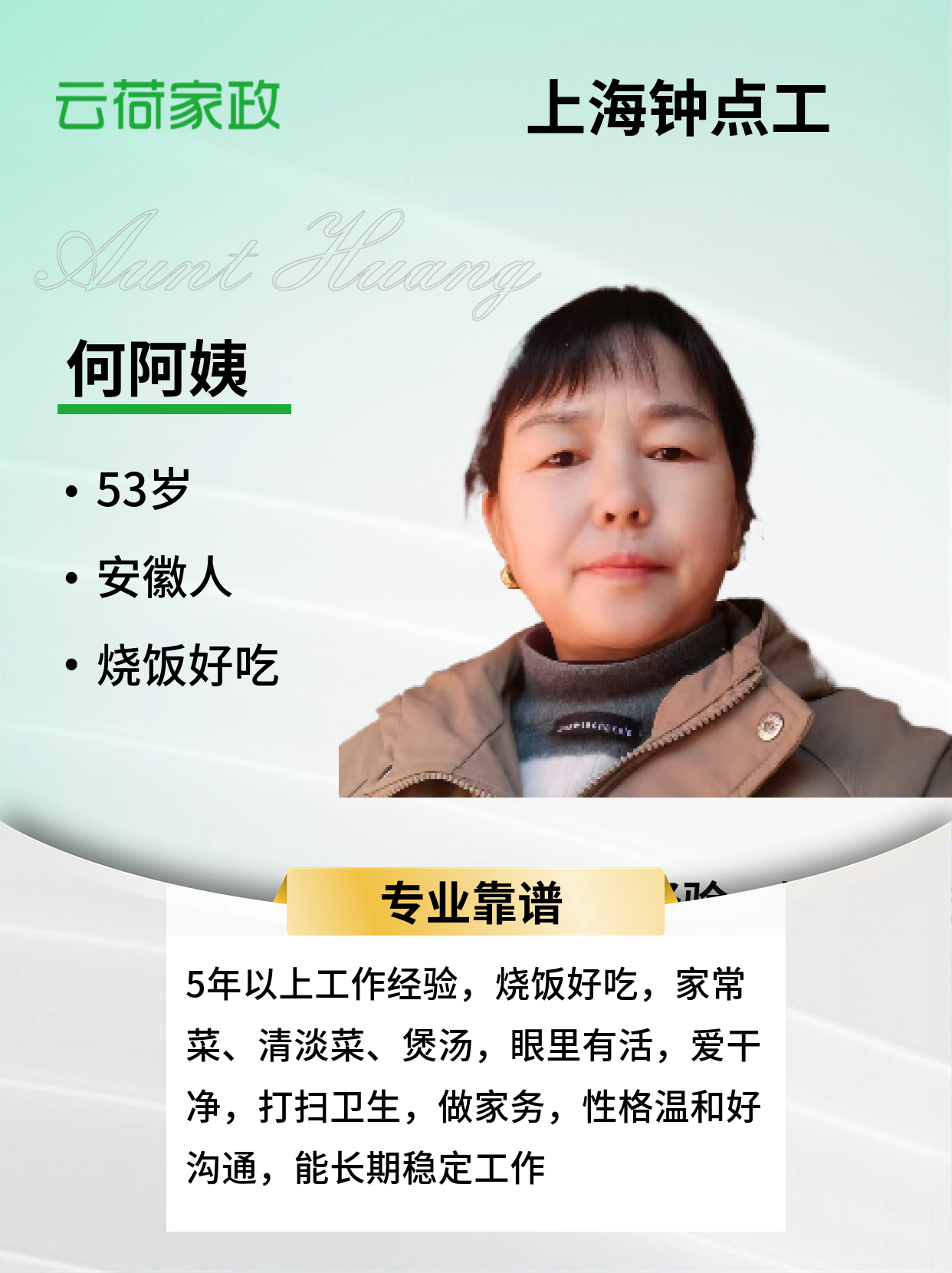 安徽人,有5年及以上工作经验,从事钟点工、保洁、保姆等相关工作,有等相关经验。干活利索,有条理,性格也很开朗,好相处。