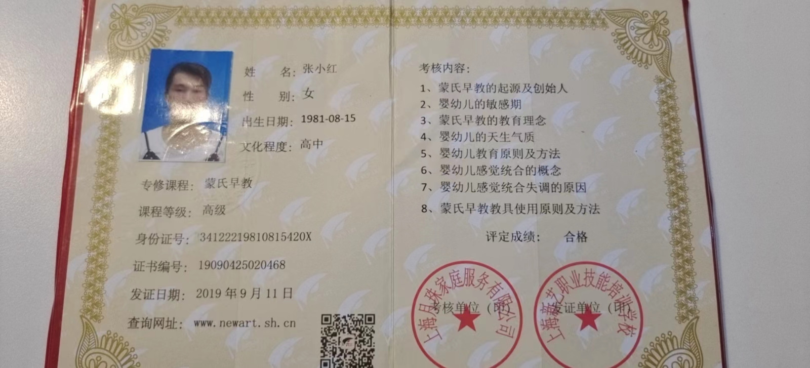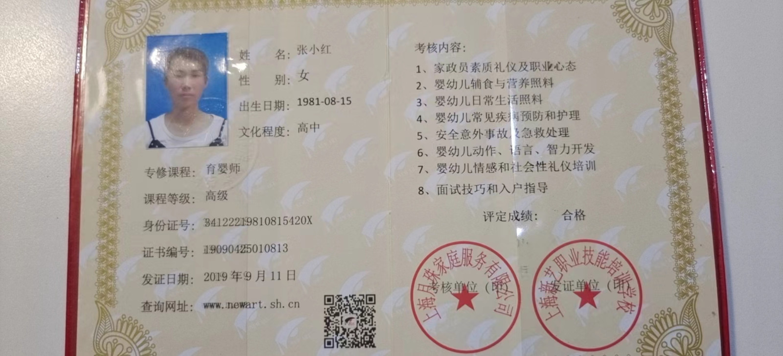 证书:高级育婴师,蒙氏早教证,健康证,身份证