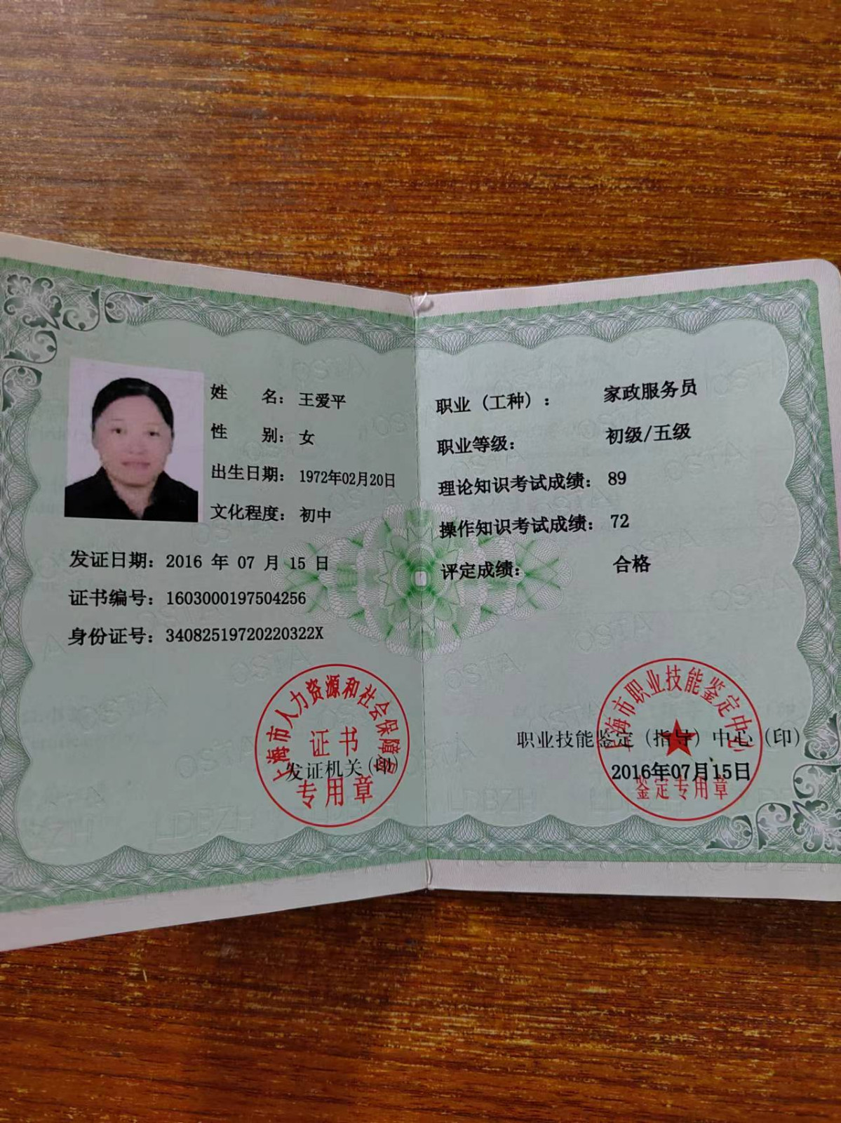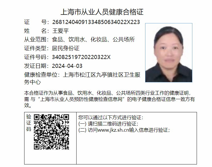 姓名:王爱平 性别:女 年龄:52岁 民族:汉 籍贯:安徽 学历:初中 擅长:煲汤清蒸,清淡的家常菜,上海本帮菜,安徽本帮菜,收纳整理 今年52岁,我真诚善良,有爱心,尊老爱幼,情绪稳定有爱心,在上海从事11年的家政工作,做过上海人,浙江人,台湾人家,还有朝鲜族,煲汤清蒸,清淡的家常菜,上海本帮菜,安徽本帮菜,擅长整理收纳,做事认真仔细,有责任心