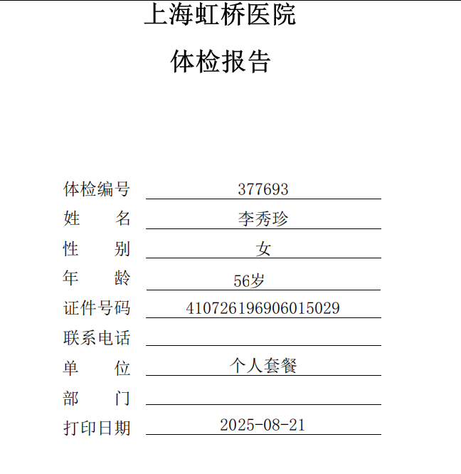姓名:李秀珍 年龄:55 户籍:河南 学历:初中 身高:165 体重:132 现住地址:徐汇区复兴中路汾阳路 2022一2025年8月12日在上海徐汇区五口之家,烧饭保洁
