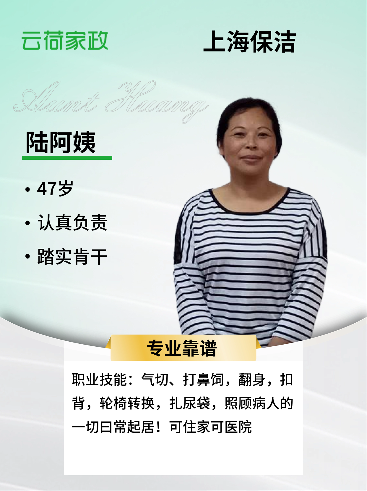 温馨提示:云荷家政平台发布的简历信息由劳动者本人提供,云荷家政平台对信息的真实性、及时性、正确性均不做任何形式保证。