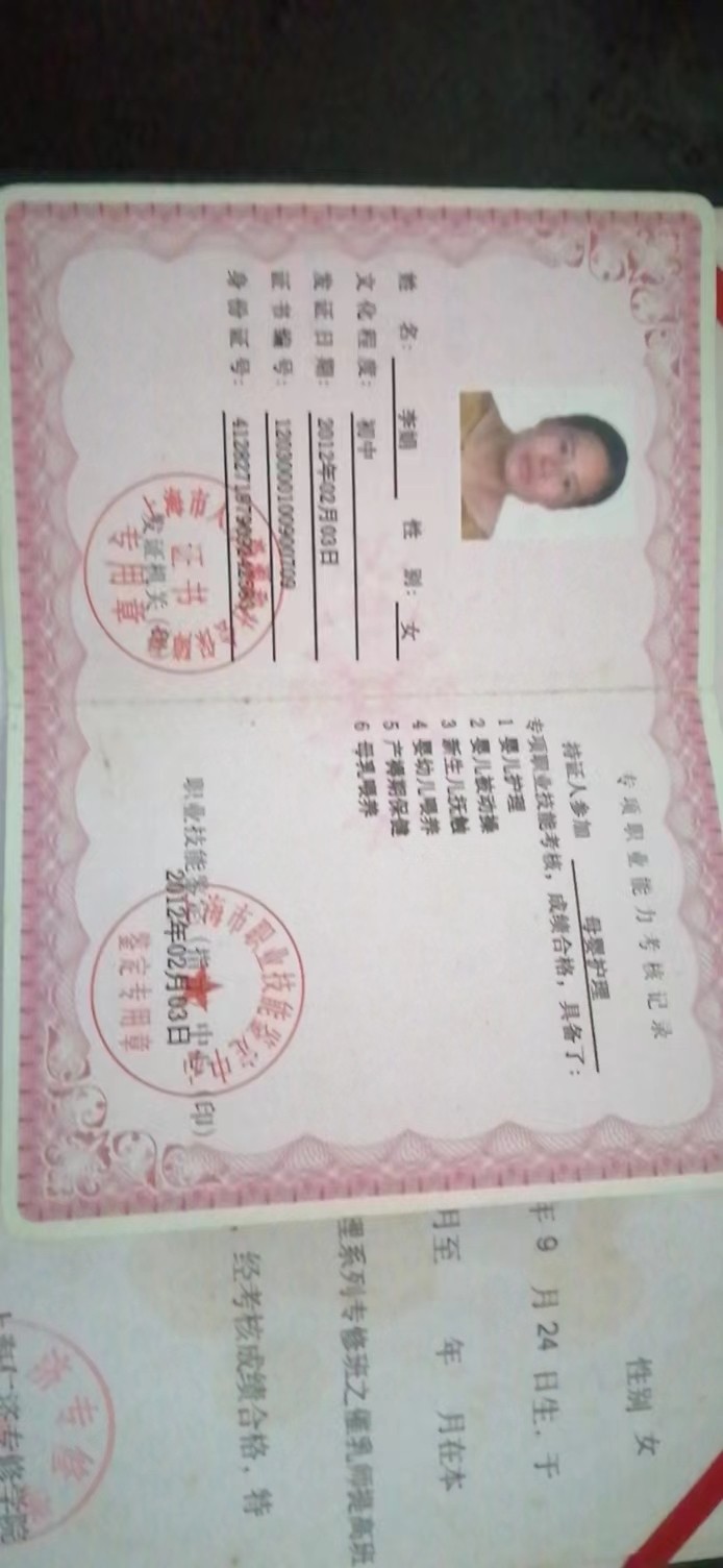证书:母婴护理师,育婴师证,健康证,早教证