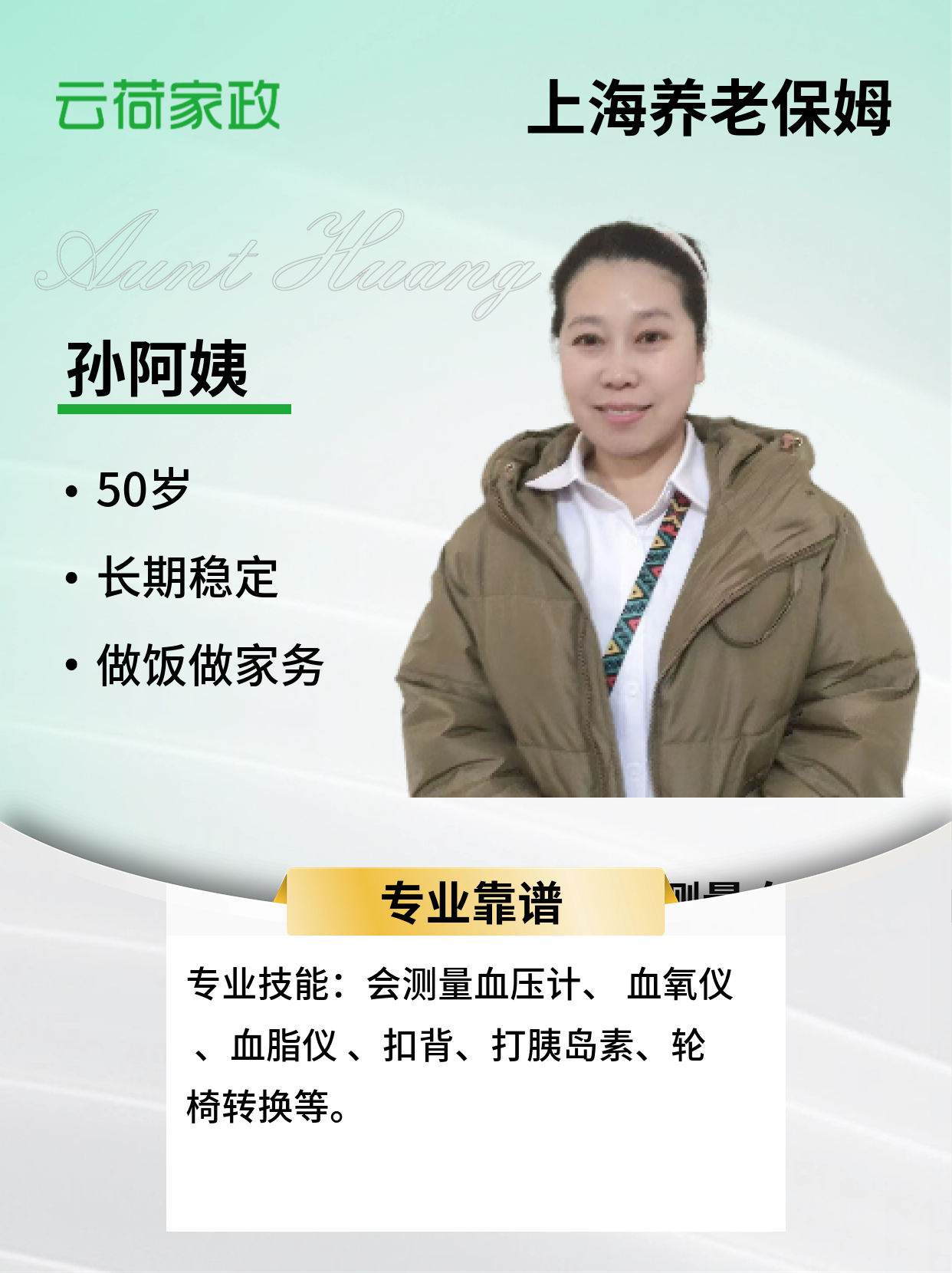 我性格温和有耐心,普通话标准有一定文化,喜欢与老人相处,有4年照顾上海本地老人的经验。我对任何工作都认真负责,有足够的爱心和耐心照顾老人日常生活起居。