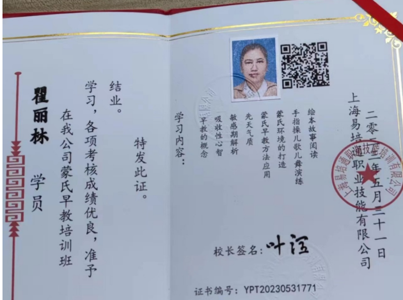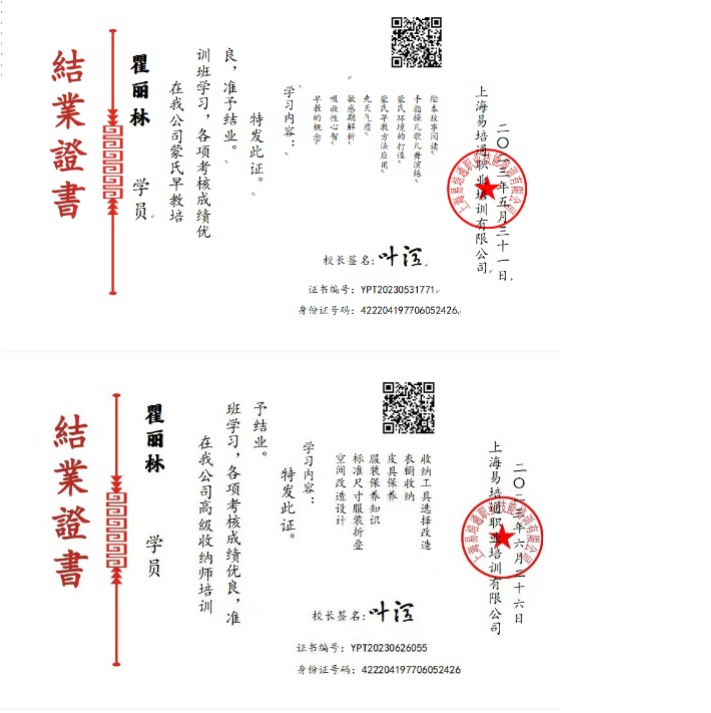证书:高级蒙氏早教、高级育婴师证、中西歺证,收纳证书,健康证