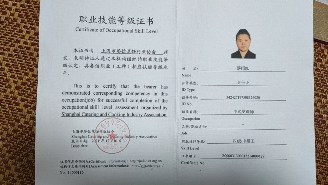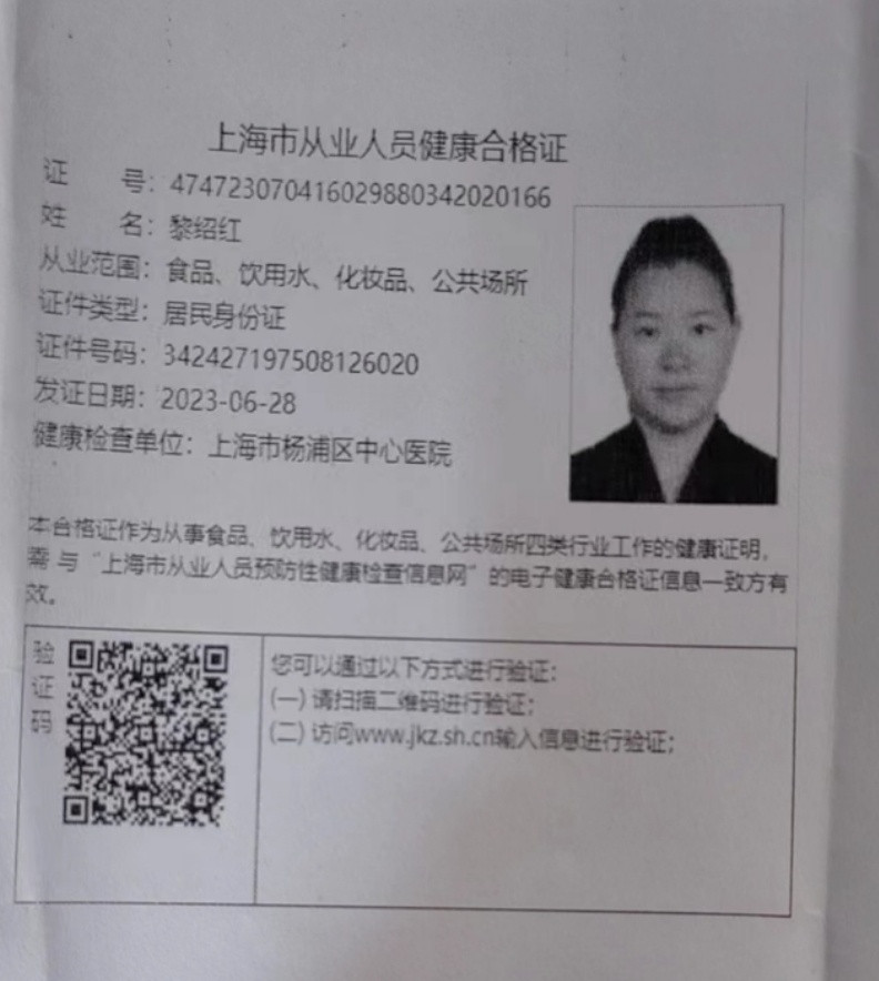 姓名:黎绍红 年龄:1975年 籍贯:上海 学历:高中 阿姨简单介绍:阿姨平时在学校食堂上班,有厨师证,能烧一桌好菜。(健康证网上可查询) 2012年至2019年在新协通国际大酒店制作菜肴九年,2020年至今在向阳幼儿园烧菜。