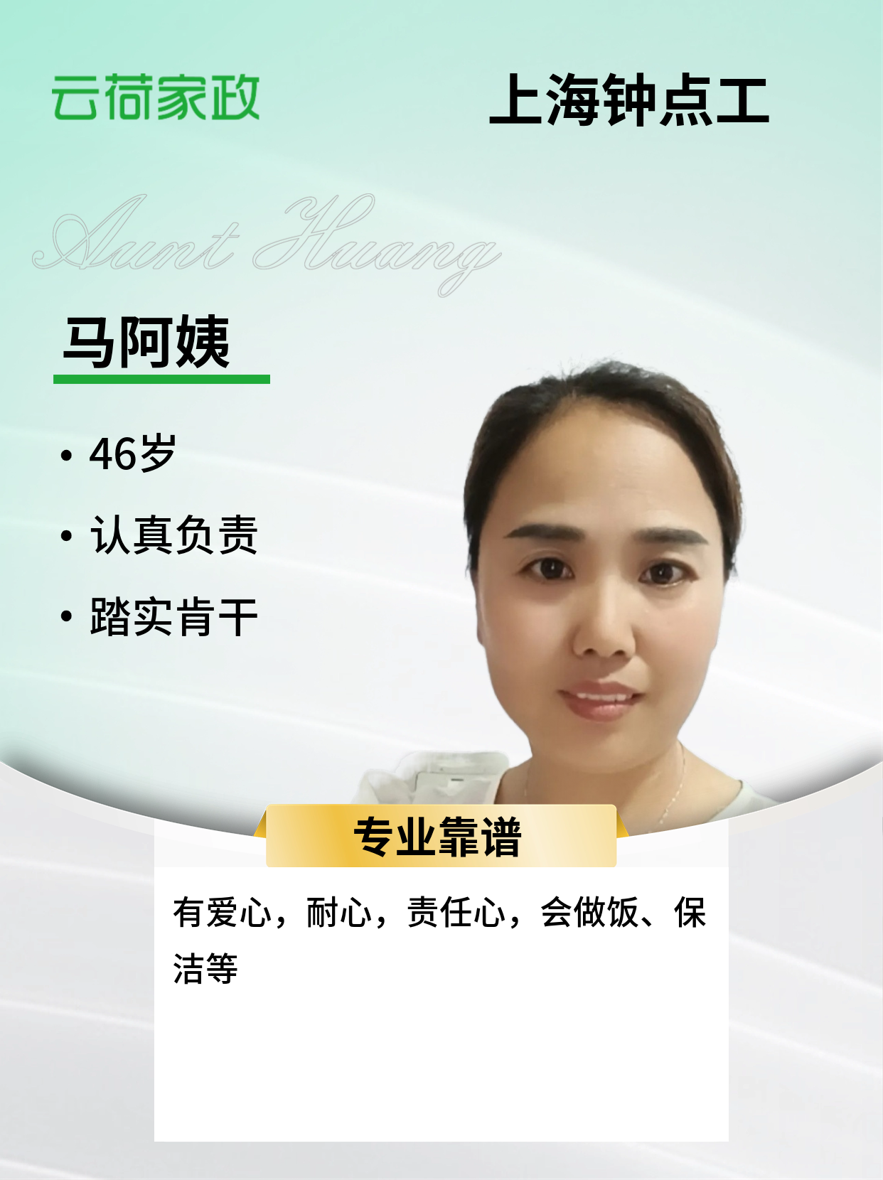 姓名:马冬香 户籍:河南 学历:初中 年龄:45 身高:155cm 体重: 52kg 工作经历: (2022年到2023年)在青浦区练塘带过一个15月女宝,120平米,主带15个月女宝,宝宝的一切,附带卫生,偶尔做饭, (2023年到2025年)在上海普陀区西部名底带双胞胎兄弟,洗漱,陪玩,宝宝一切,接送上下学,打扫卫生。 推荐理由:阿姨人老实本分,好沟通,不计较,会读绘本,真心喜欢宝宝,有爱心,耐心,责任心,会做饭、保洁等