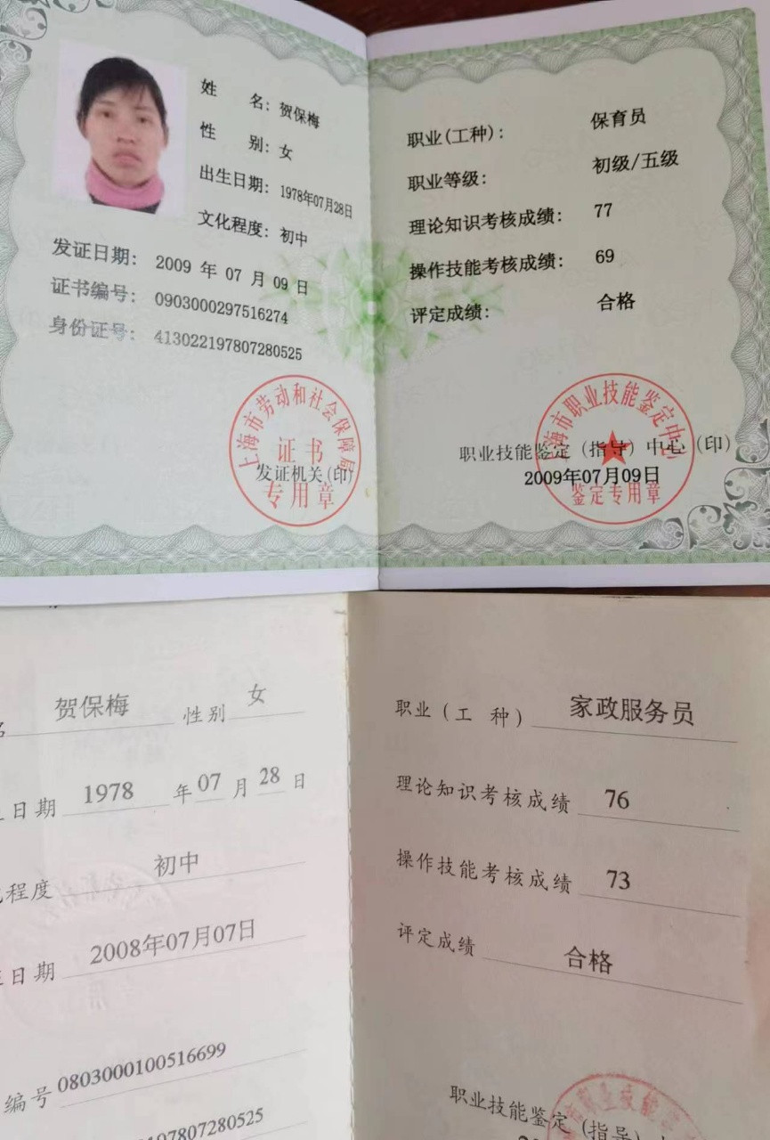 证书:保育员证:家政证书