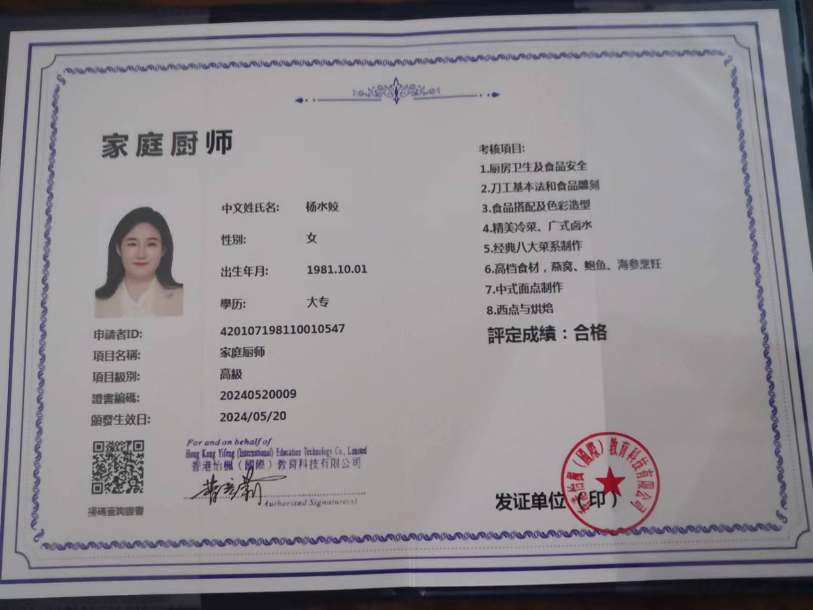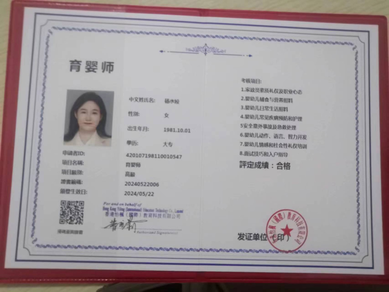 专业证书:育婴师+理疗师+厨师证+驾驶证