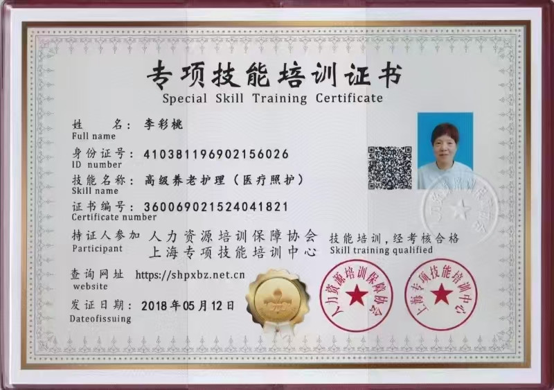 专业技能:造口,打流食,扎尿袋,抠大便,推轮椅,给老人翻身扣背,给老人换床单被罩,洗头喂药,换尿垫尿裤,床上擦浴,测血糖,量血压,打胰岛素。