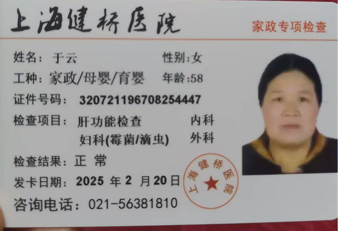 2019年至2020年在徐汇区住家,主要照顾一个患癫痫的男老人,烧饭保洁。