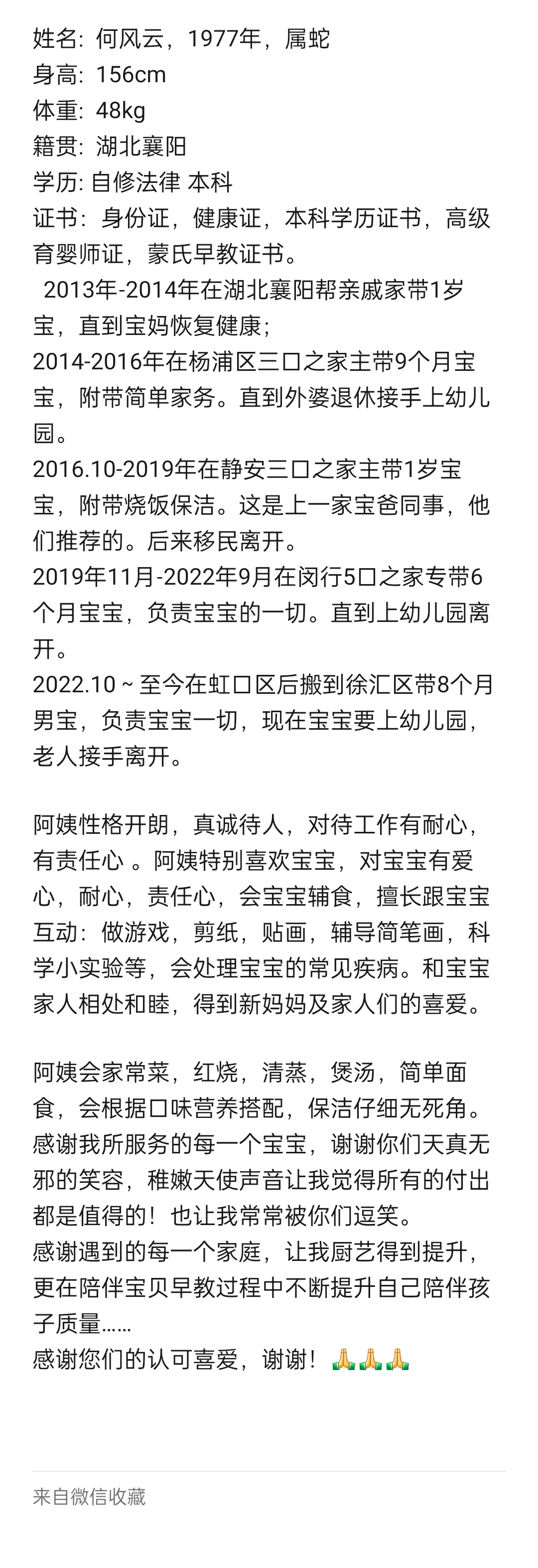 耐心,爱心,责任心,懂心理学,会做各种口味菜,工作细致,陪伴3个宝宝早教,托班,幼儿园经验丰富。家庭无负担,一个女儿已经在985大学大四了,可以长期稳定工作。