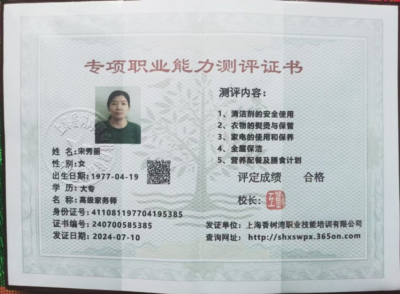 【已获证书】毕业证,管家证,家务师证,厨师证,收纳证,辅食证。