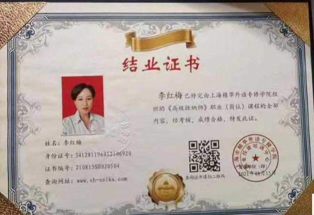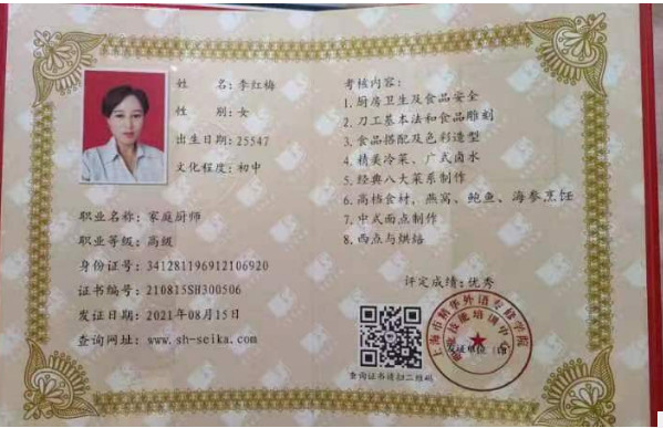 技能证书:驾驶证,高级厨师证, 高级收纳证。