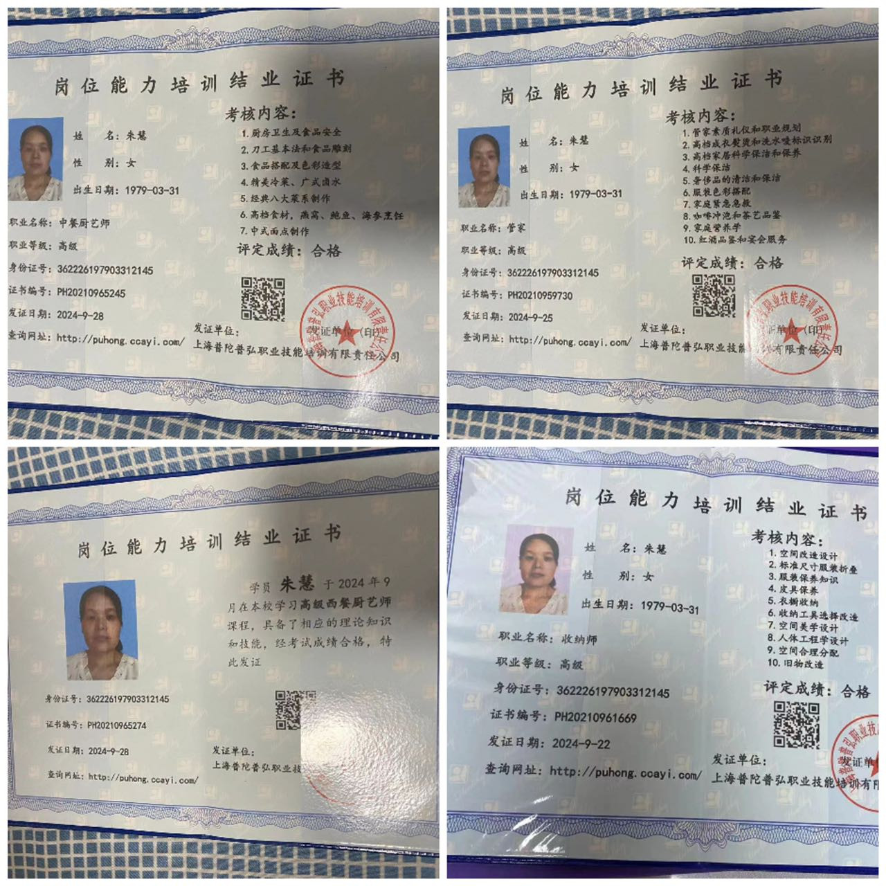 相关证件:高级收纳证、管家证、中餐证