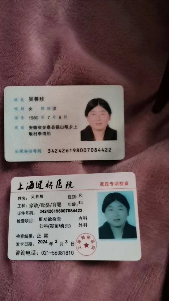 姓名:吴善珍 户籍:安徽 年龄:43岁 学历:初中毕业 身高:160 家政经验:6年 工作劲历:2016--2018年在中山北路,带一个一周岁男宝宝,烧饭保洁,奶奶来带阿姨下单了, 2019--2021年在徐汇区斜土路做带半岁左右宝宝,附带家务 2020—2024复地北桥城做带6月宝宝起带,辅食早教 阿姨性格温和好相处,有耐心不计较,做事认真负责,喜欢孩子,对宝宝细心有耐心,人品素质高稳定性好 。