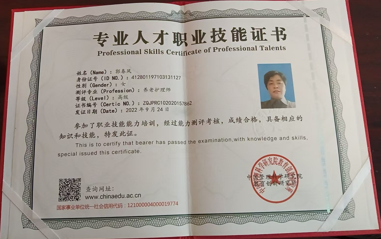 本人性情温和,富有热心,爱心,对待老人的护士不怕繁索,不怕,能吃苦,不怕累,能视护理对象如自己的家人一样。