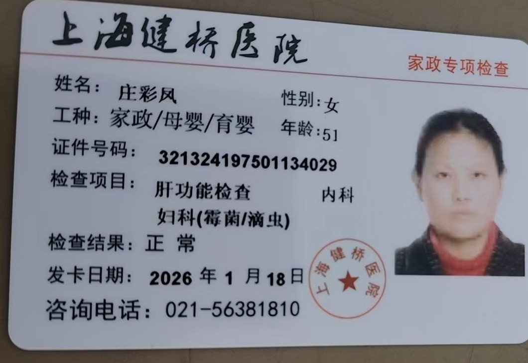 姓名:庄彩凤 籍贯:江苏 年龄:49 身高:160 体重:126 学历:初中 居住地杨浦区宁国路 特长:会点面食 岗位:钟点工、育儿嫂 在上海从事家政服务员10年以上, 工作经历;曾经在海上海、翡丽甲第天下、悦滨江、白金府邸做过。 本人做事认真负责,烧菜好吃,收纳仔细,会熨烫简单衣服、会做宝宝辅食,带过大小宝宝 家庭情况:三口之家,老公在做木工 儿子上大学