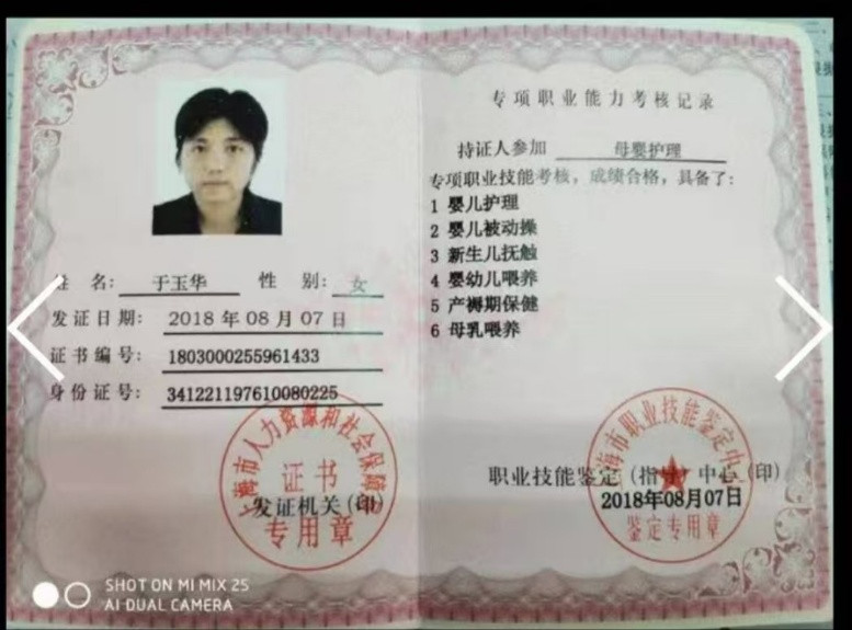 技能证书:身份证,健康体检报告,早教师证,母婴护理证