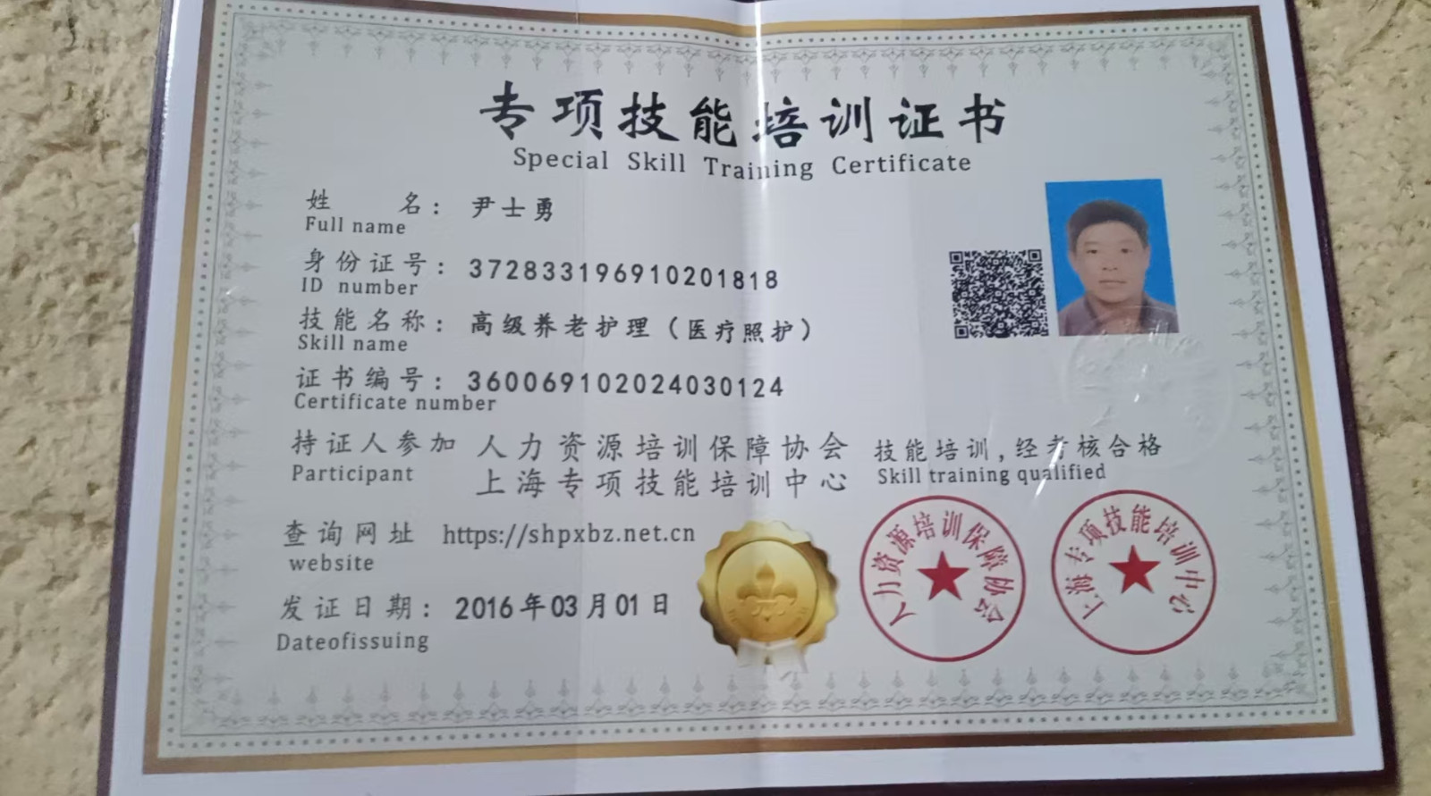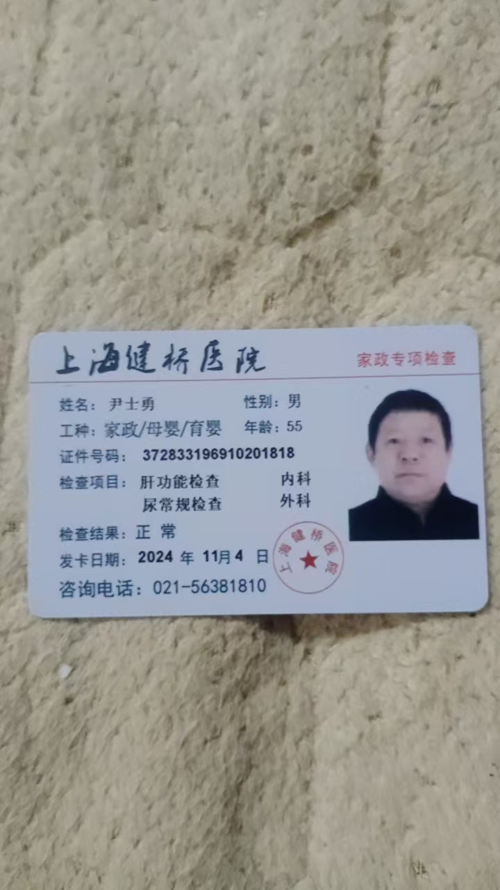 求职:护工 姓名:尹士勇 籍贯:山东 属相1969年 学历:初中 年龄:54 身高:1.70 体重:150 证书:医疗照护 工作经历:7年多 本人老实勤劳不怕苦不怕累,不怕脏,电话15064960327 从2016年一2023年分别在上海虹口第一人民医院,建工医院,沪东医院,徐汇中心医院,长海医院,华山医院,肺科医院,第六人民医院等等,上海镇宁路,延安西路,江苏路浦东桃林路,博华路等做 照顾全护理病人。 翻身扣背洗澡,打流食 扣大便 ,等等都会