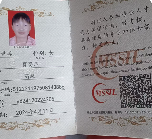 姓名:王世琼 年龄:49岁 籍贯:重庆 属相:兔 工作经验:7年 工作经验:2019至2020年在四川重庆,住家带7个月带多,附带家务做饭保洁 2021年至2022年在四川老家,住家带满月宝宝到1岁多,附带家务 2023年至2024年在上海带一个满月宝宝到现在,附带家务 擅长:宝宝辅食,早教,抚触,洗澡,川菜, 性格特别温柔,老实本分,做事主动