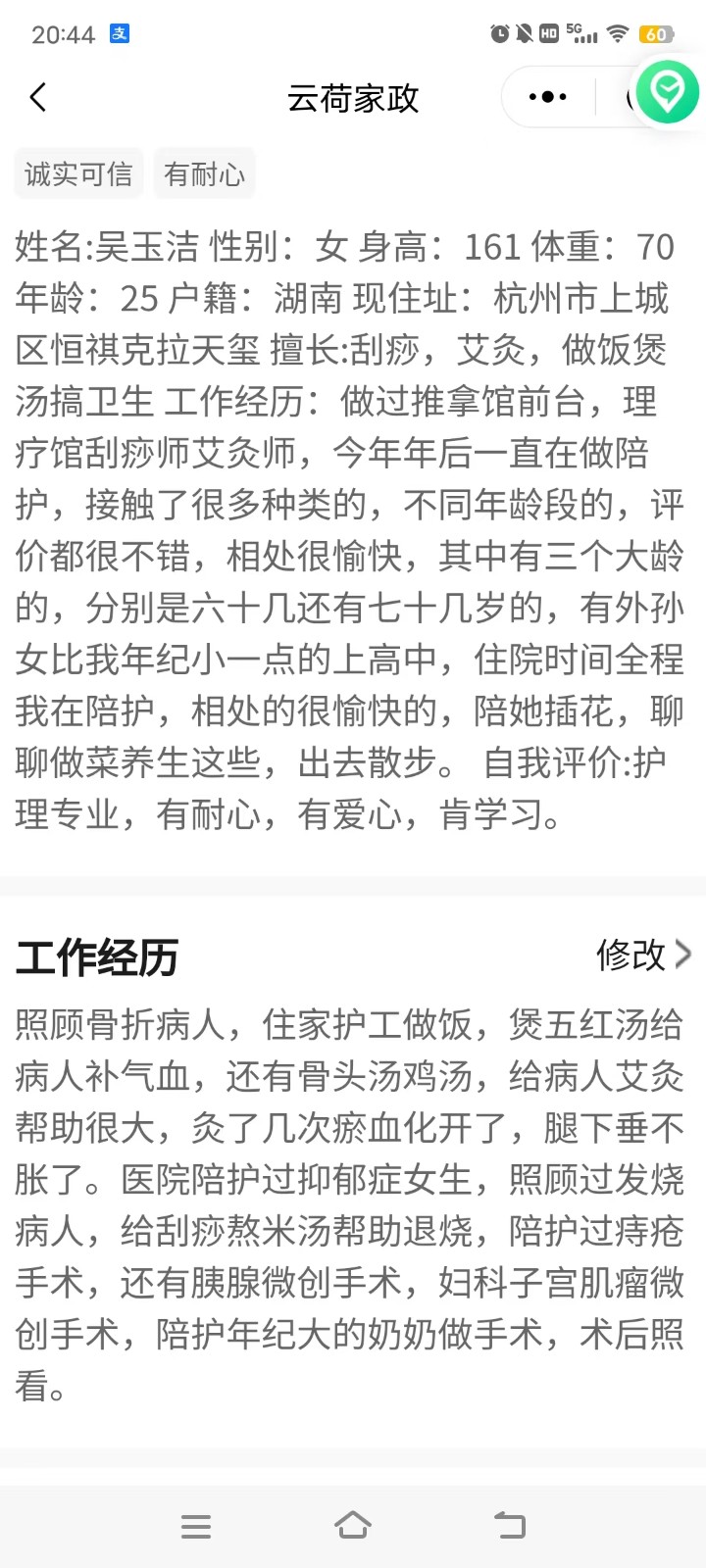 工作经历:做过推拿馆前台,理疗馆刮痧师艾灸师,今年年后一直在做陪护,接触了很多种类的,不同年龄段的,评价都很不错,相处很愉快,其中有三个大龄的,分别是六十几还有七十几岁的,有外孙女比我年纪小一点的上高中,住院时间全程我在陪护,相处的很愉快的,陪她插花,聊聊做菜养生这些,出去散步。