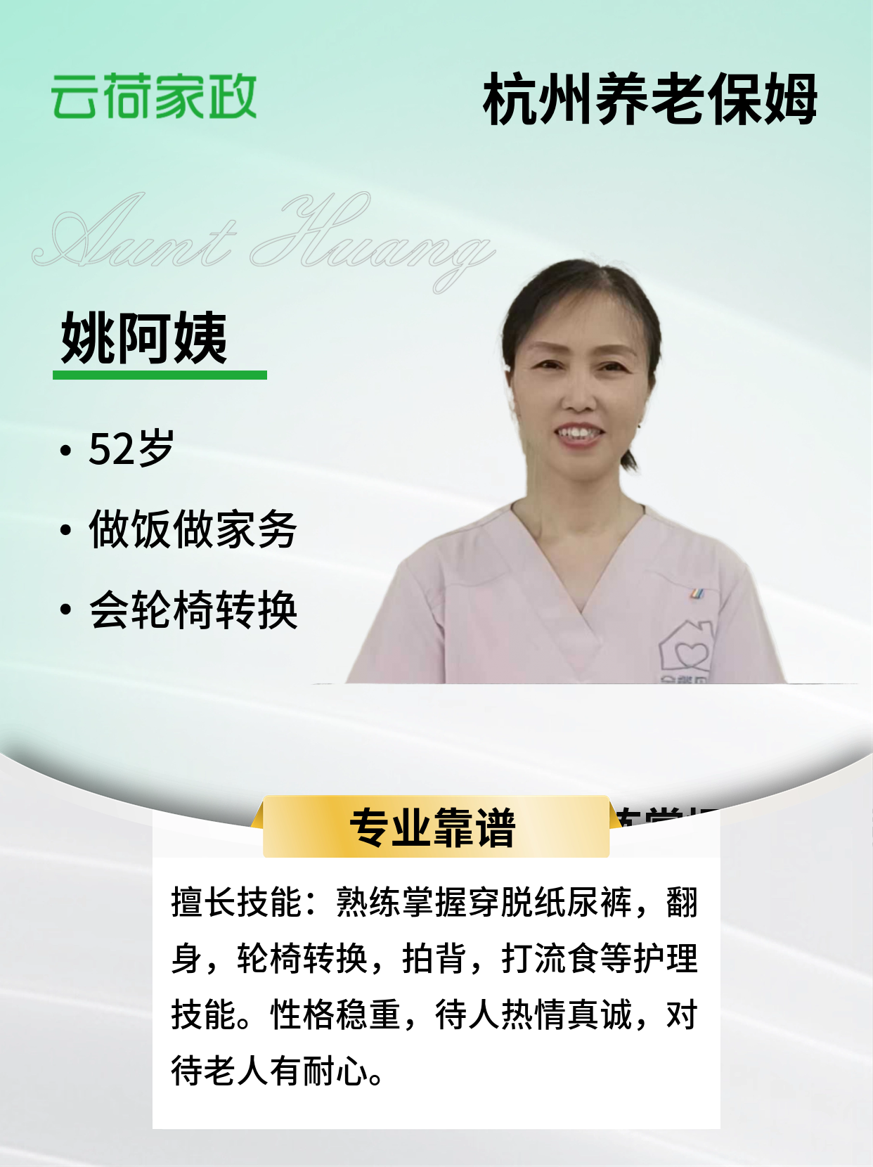 1、做照顾老人四年经验,对于自理,半自理,不能自理的老人都有丰富的经验。