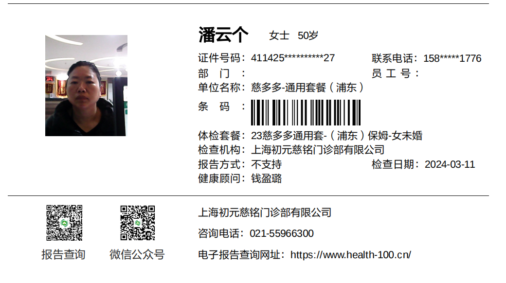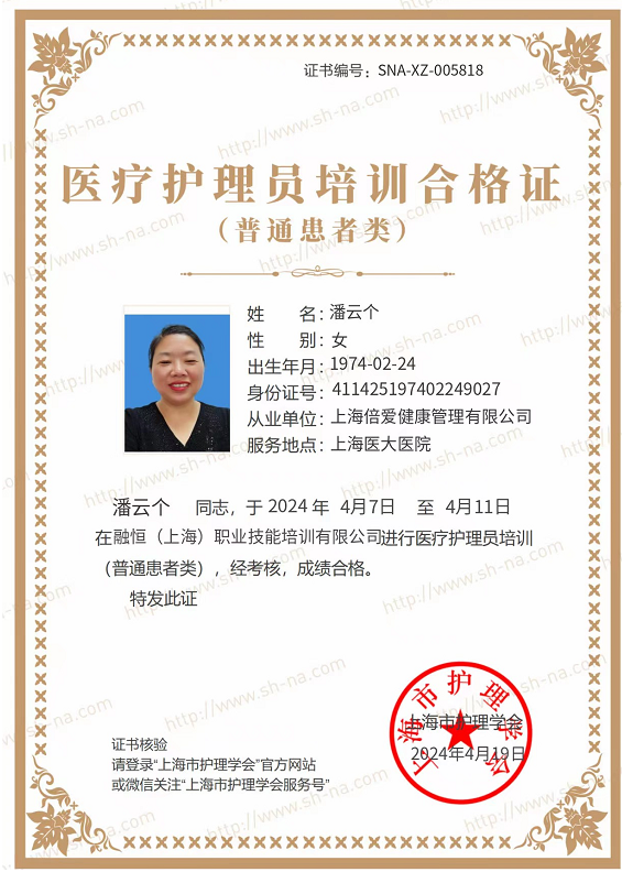 姓名 :潘云个 性别 女 年龄 50岁 身高 165米 体重 75kg 学历 初中 籍贯 河南 本人从事老年服务工作3年,在上海三甲医院,华东医院,华山医院,新华医院,等医院护理过病人,护理过不能自理的病人,护理经验会打鼻伺胃管,换尿不湿,翻身叩背,生活护理术后护理都可以。本人脾气性格人品好。做事有条理,有爱心,服务意识强。是个值得您托付信赖的好护工