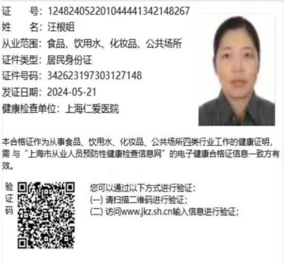 姓名汪根姐 沪籍安徽, 年龄51。 身高160, 体重1118。 初中文化, 上海家政十多年 一直做钟点工,擅长烧菜,保洁,红烧、清蒸、煲汤、海鲜都可以,会带宝宝阿姨做事手脚非常麻利,做事不斤斤计较,眼里有活,能够吃苦耐劳,服从客户安排。性格温和,人品靠谱。 住在田林8村很近的