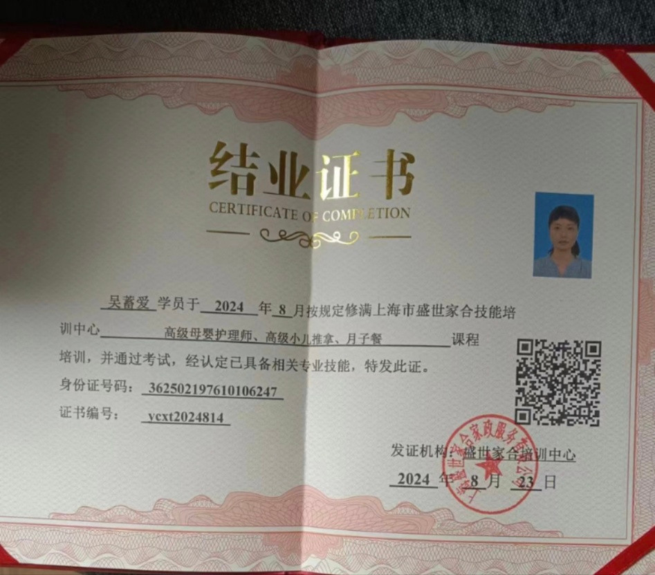 姓名:吴蓄爱 户籍:江西 年龄:48 身高:160 体重:50 学历:初中 经验:5年 2019-20208月份在世纪公园住家烧饭,保洁,收纳整理,辅助宝妈带3个宝宝,5岁,3岁,满月宝宝 2020年9月份-2024年底,带2岁宝宝,附带家务 阿姨性格温和,不斤斤计较,好相处,会读绘本,做游戏,讲故事,养成良好生活习惯