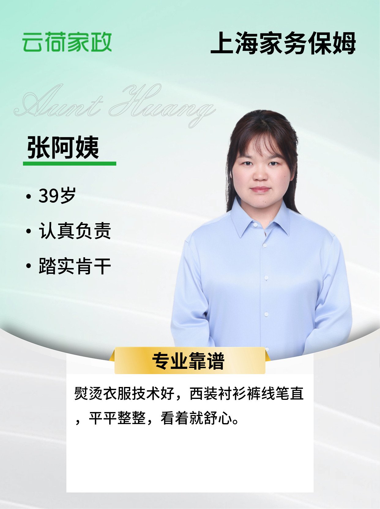 性格开朗,擅长家常菜,煲汤、清蒸、红烧、不计较不八卦,做事认真、对客户家宝宝宝有爱心、有耐心,服从客户安排。
