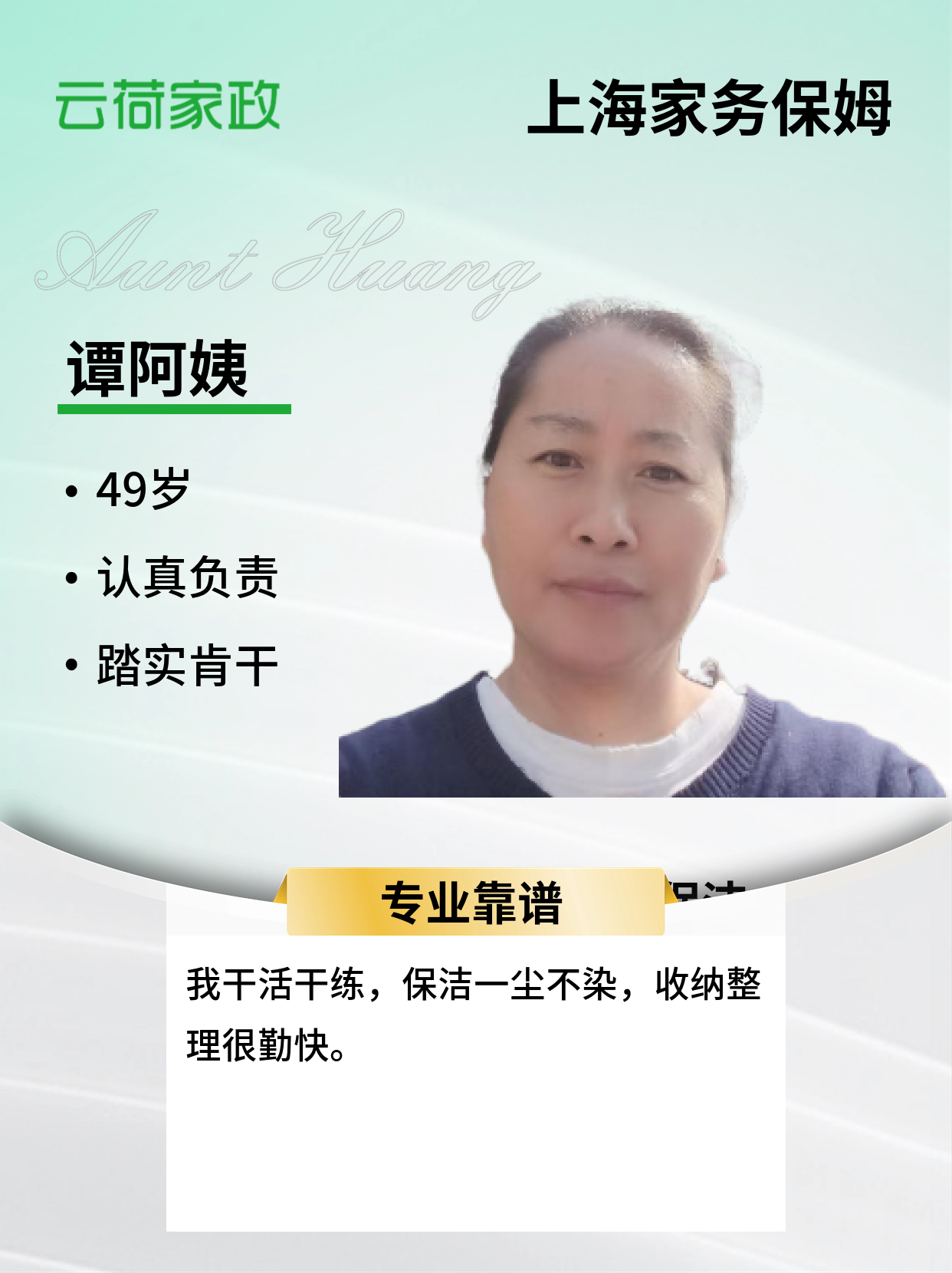 阿姨性格温和好相处,有耐心不计较,做事认真负责,人品素质高稳定性好 。