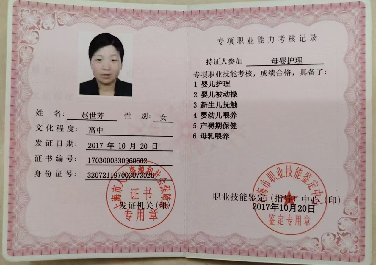 本人从事家政行业10年,对宝宝,对老人,认真负责,细心,有爱心,懂早教,讲故事,做游戏,辅食添加。对老人有慈心,耐心,精心尽力,做菜多样化,简单海鲜,家常菜,会做饺子,面条,馒头,包子,多种面食。性格温和开朗,责任心强,脾气好,易沟通,从业期间深得客户好评。
