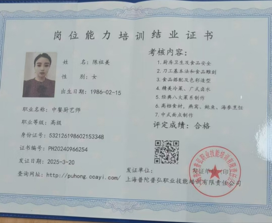 2021年至2024年,陈祖美在饭店工作了3年时间,擅长烹制各类家常小炒菜。
