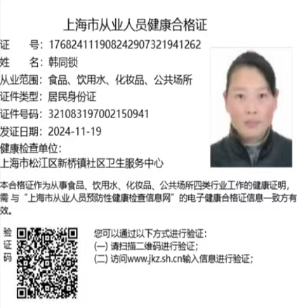 姓名:韩同锁 籍贯:江苏 年龄:54 学历:初中 身高:163 体重:62 证书:做饭师, 工作简历:9年 从2016年开始做家政。 从两个月宝宝带到5周岁,做饭,打扫卫生。 钟点工和早出晚归都做过,卫生到位,烧饭按客户口味,本人做事认真,带宝宝细心,负责,有爱心,耐心,好沟通。