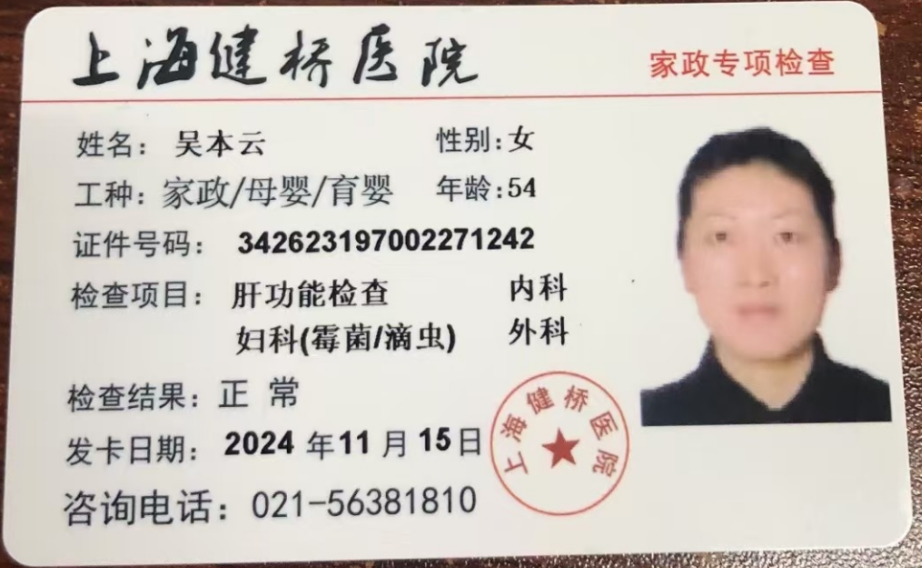 姓名:吴本云 文化:初中 身高:1米58 籍贯:安徽 年龄:53岁 体重:57公斤 从事家政8年,一直在静安区,普陀区,黄浦区,徐汇区做的 照顾过全护理男老人,擦身,换尿布,处理大小便,喂流食都可以 擅长家常菜,上海菜,海鲜,煲汤,烫衣服都可以,保洁到位干净清爽有条理,性格开朗,稳重踏实,人品好,有爱心,有耐心有责任心,好沟通,不计较