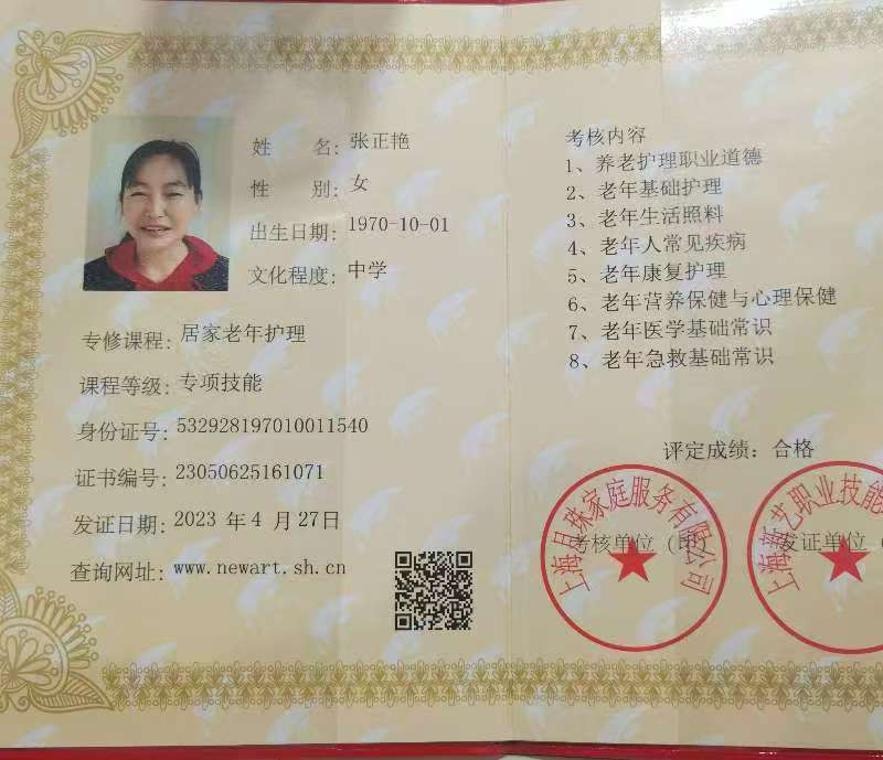 2022年5月-2023年2月在上海护理院照顾各种类型的老人(如半自理,不能自理,老年痴呆等)。