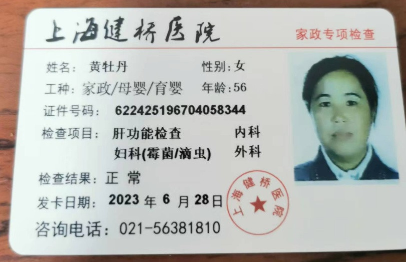 姓名:黄牡丹 性别:女 年龄:身份证56岁,实际年龄52岁 学历:初中 身高:1米58 体重:55kg 家政:做饭、保洁 工作经历:家政20年 做过台湾,香港,法国,上海家庭,带过宝宝,擅长做辅食,烧菜好吃,烘焙,清蒸,海鲜,红烧,煲汤,川菜,辣菜,营养搭配,馒头包子,水饺混沌煎饼,拉面都会做,保洁到位,收纳整理,做事麻利,不爱计较,为人踏实本分好相处,说话有亲和力,性格温柔