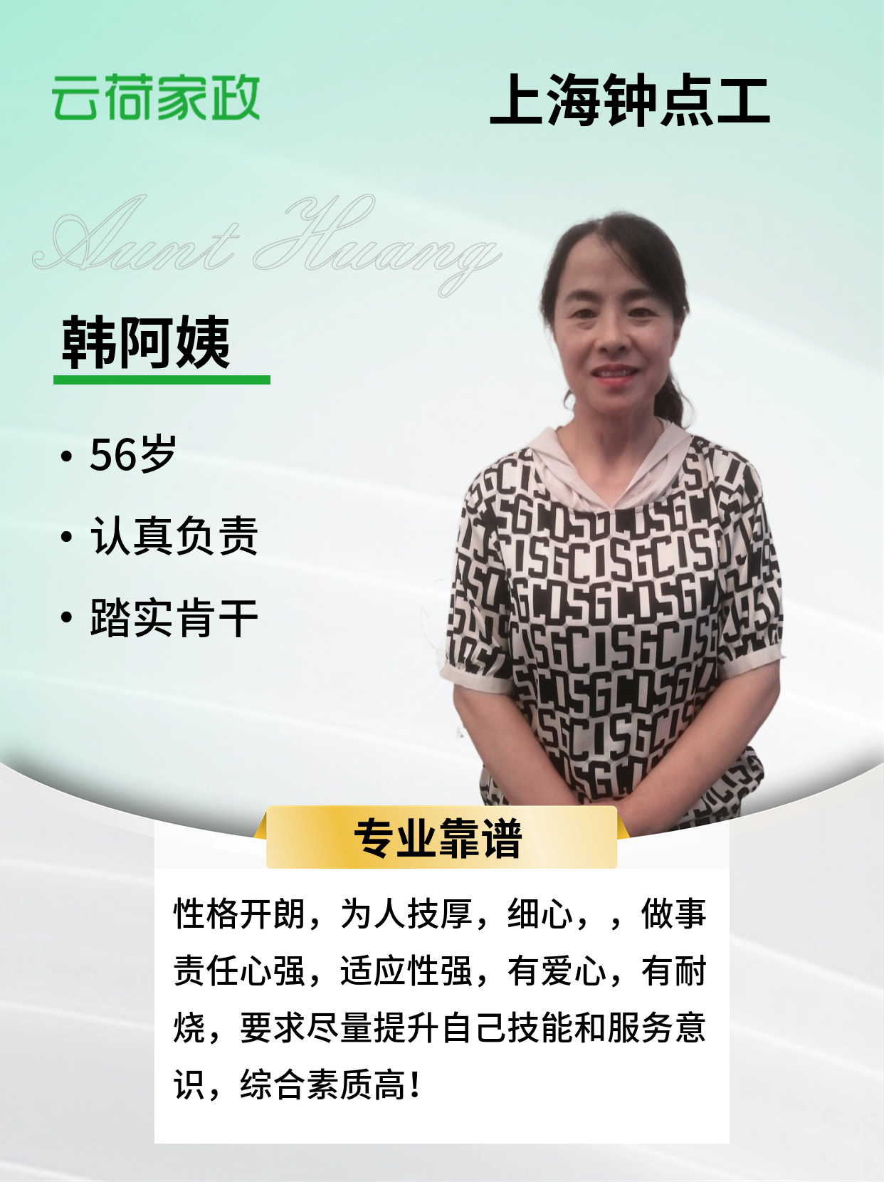 姓名 韩喜梅 性别:女 年龄: 55岁 户籍 :河南 身高 :158Cm 体重:60㎏ 学历:初中 工作简历 : 2016年在黄浦住家,接送小孩上下幼儿园,烧饭保洁收纳,保洁。 烧菜,家常菜,海鲜,煲汤,面食,可以根据雇主的口味调整, 2022一2025在静安区延长路做钟点工烧饭保洁,整理收纳。 本人性格开朗,为人技厚,细心,,做事责任心强,适应性强,有爱心,有耐心,综合素质高!