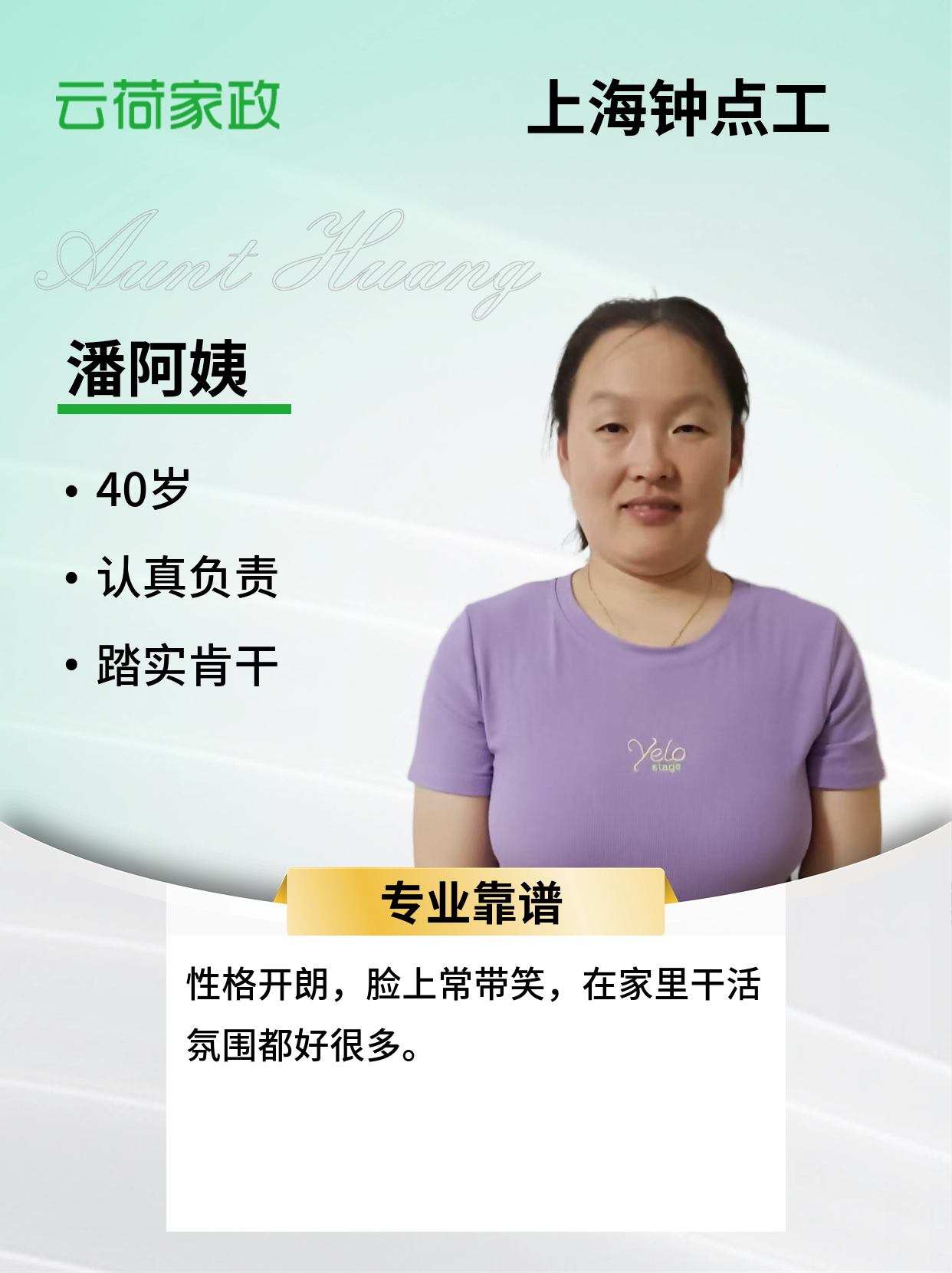 姓名 潘海燕 年龄 40 籍贯 安徽 学历 初中 身高 156cm 体重 115斤 家政经验10 证件身份证健康证 2015年至2025年在虹口、新静安区等地方做钟点工 在浦东康桥中海御景熙岸做,后来我又做了5年的保洁。 特长:家常菜做的都还行,整理收纳 打 性格开朗,眼里有活,做事麻利。能接受客户安排工作。不斤斤计较。