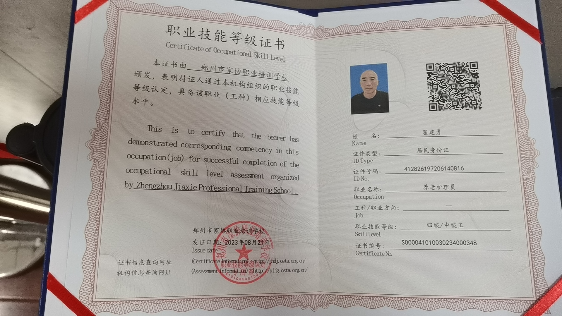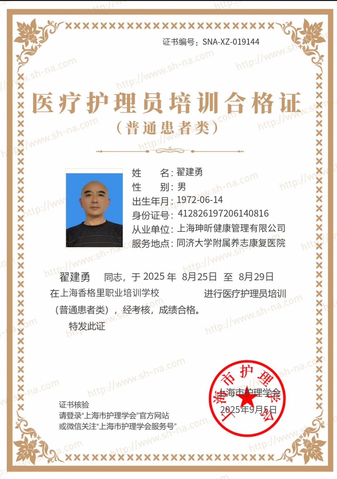 专业证书:养老护理中级证书,上海护理学会证书。