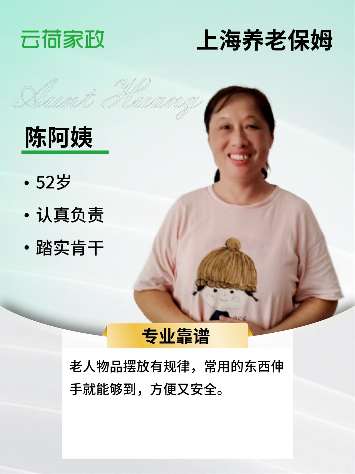 家常菜做的好,川菜做的好,本帮菜做的普通;普通话说的一般,希望上工的场所可以住家;