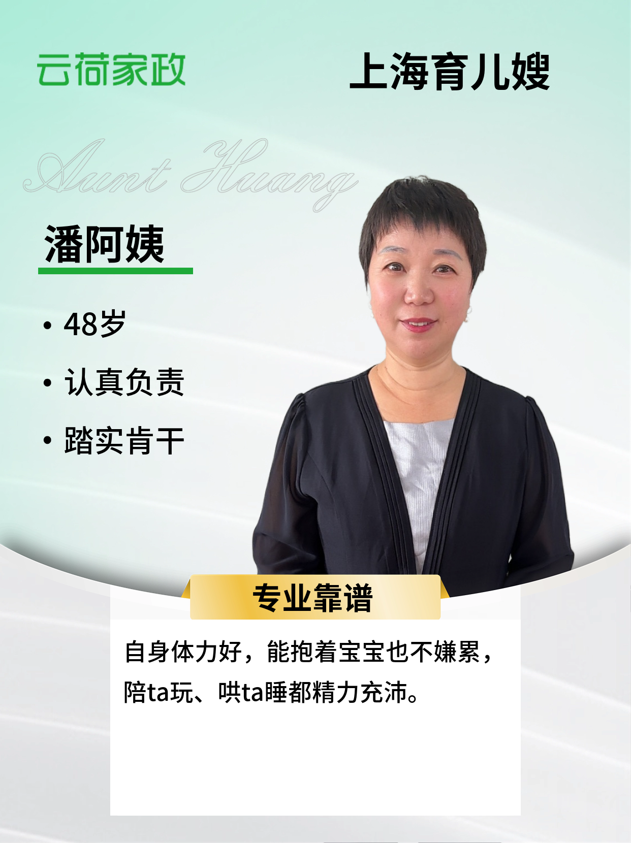 阿姨性格温和好相处,有耐心不计较,做事认真负责,人品素质高稳定性好 。