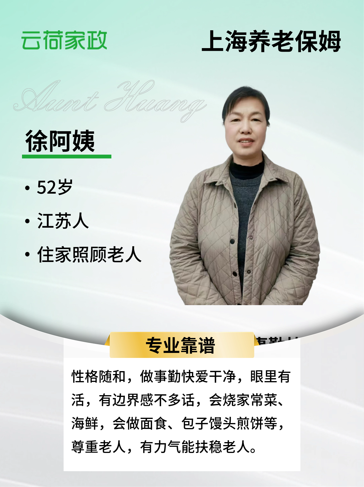 阿姨性格好 喜欢孩子, 尊重老人,对老人象自己父母, 有亲和力 ,给孩子讲故事 ,互动 ,做事勤快 ,眼里有活 ,人随和 不计较 ,不参与客户家任何事 ,不多话 ,是个人品好 ,素质高的好阿姨,以家常菜海鲜为主,会做包子馒头,煎饼