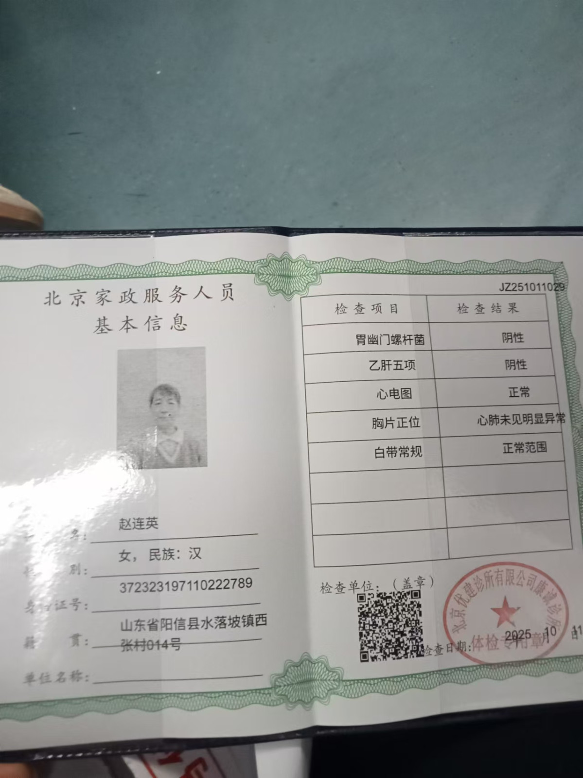 姓名:赵连英 籍贯:山东 年龄:52 学历:初中 身高:160 体重:130 民族:汉 属相:猪 工作经历:从事家政行业5年了,一直做饭做家务照顾老人。 2018-2020年在做家务做饭2年 2020-2021年在朝阳照顾老两口男老人半自理1年。 2021-2022年在惠新西街照顾不自理老人一年。 2022-2023年在北京医院家属院照顾痴呆老人1年。 性格评价:性格温和,有爱心耐心,服从安排 技能方面:擅长做饭做家务,家常菜,炒菜,面食等