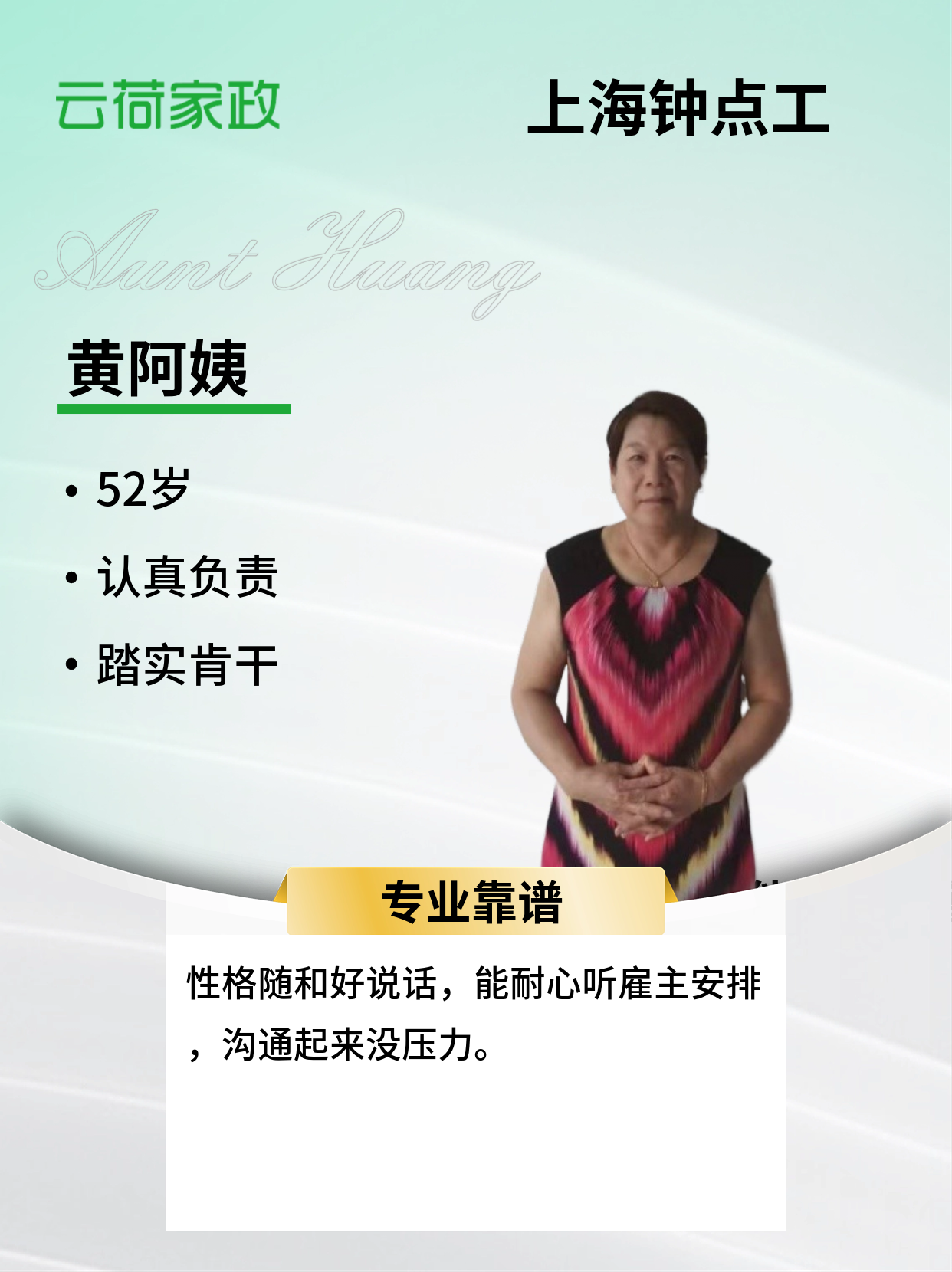 阿姨性格温和好相处,有耐心不计较,做事认真负责,人品素质高稳定性好 。