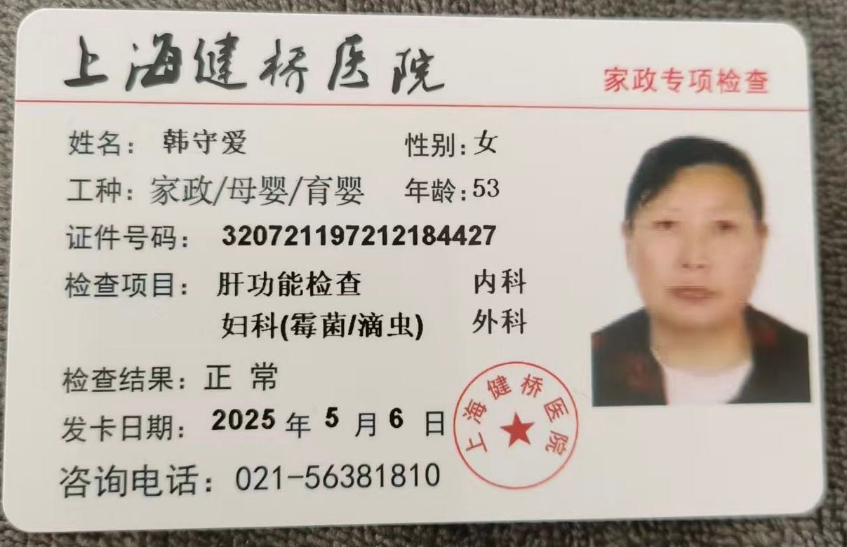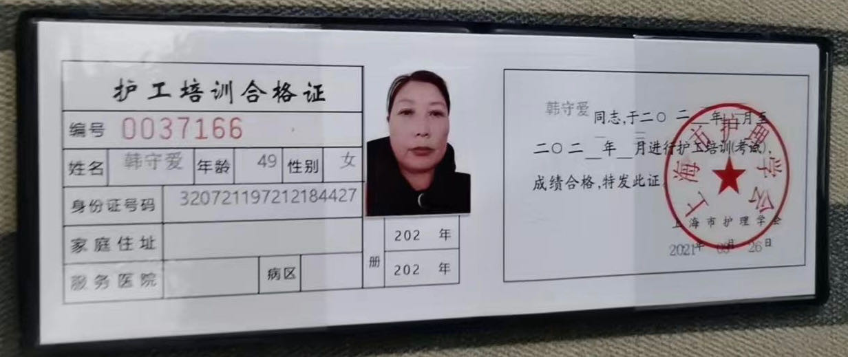 求职:护工 姓名:韩守爱 籍贯:江苏 属相1972年 学历:初中 年龄:52 身高:163 体重:140 工作经历:5----6年 本人老实勤劳不怕苦不怕累,不怕脏, 从2019一2020年分别在上海虹口第一人民医院,长海医院,华东医院,建工医院,华山医院,江湾医院第四人民医院,第六人民医院,瑞金医院,中山医院,仁济医院,在医院做过一对多护工等等,,,上海镇宁路,延安西路,江苏路浦东桃林路,博华路等做 照顾全护理病人。 翻身扣背洗澡,打流食 扣大便 ,等等都会。